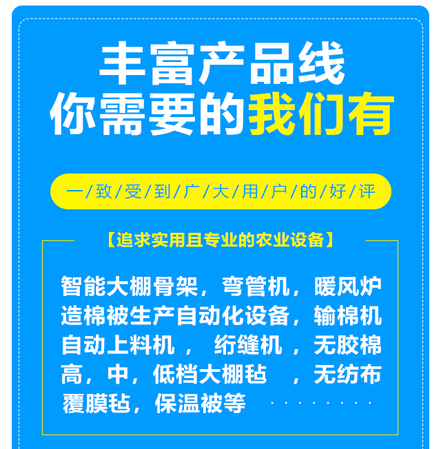 本公司設(shè)備齊全,可生產(chǎn)智能大棚骨架,彎管機,暖風爐等農(nóng)業(yè)設(shè)備,另制造棉被生產(chǎn)自動化設(shè)備,自動上料機,輸棉機,絎縫機等。質(zhì)量可靠,注重創(chuàng)新。公司擁有雄厚的實力,先進的生產(chǎn)線,豐富的經(jīng)驗,可根據(jù)客戶的要求定做高,中,低檔大棚氈,無紡布,無膠棉,覆膜氈,保溫被等,車間日生產(chǎn)新型棉被10000平方米以上,能滿足各種客戶的需求,新型保溫被產(chǎn)品在國內(nèi)研發(fā)中始終保持在前列。