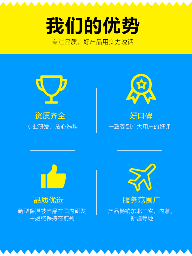 我們本著客戶之上,服務(wù)至上的原則,爭創(chuàng)國內(nèi)保溫被行業(yè)的引導者。